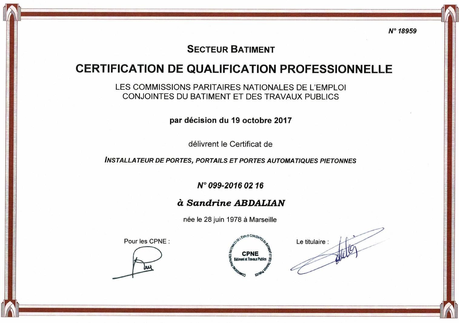 En plus de justifier d'une expérience professionnelle de plus de 25 années passées dans le secteur de l'électronique et des fermetures automatiques, le gérant d' Abd Automatismes Les Pennes Mirabeau (13170) justifie aujourd'hui d'une certification "installateur de portes et portails automatiques" décernée par la Fédération Française du bâtiment.